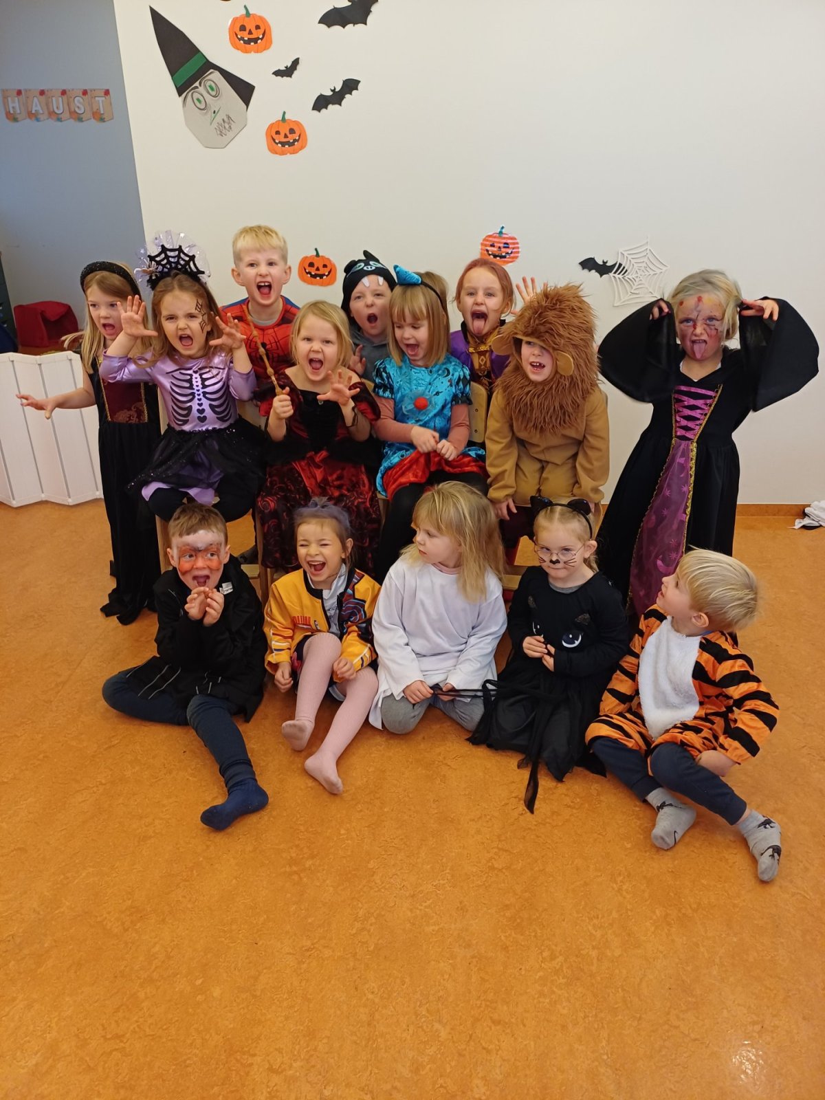 Loksins rann dagurinn upp og mættu allskonar verur og fígúrur í leikskólann um morguninn. Haldið var Hrekkjavökuball inni á Kvisti hjá elstu nemendum og allir nemendur leikskólans fóru í tónlistartímana sína á föstudaginn sem voru með Hrekkjavökuþema. Eftir spennumikinn dag fóru allar verurnar heim til að gera sig klár í meira Hrekkjavökufjör enda nóg til af orku!