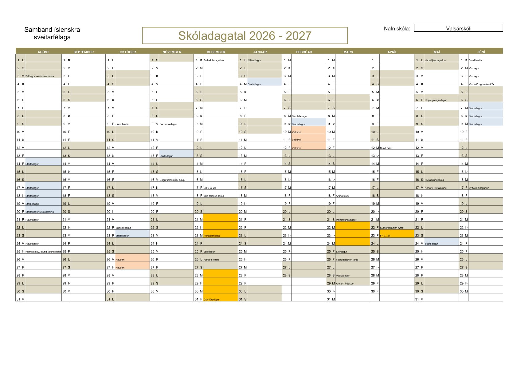 Skóladagatal Valsárskóla er tilbúið og samþykkt fyrir skólaárið 2026-2027