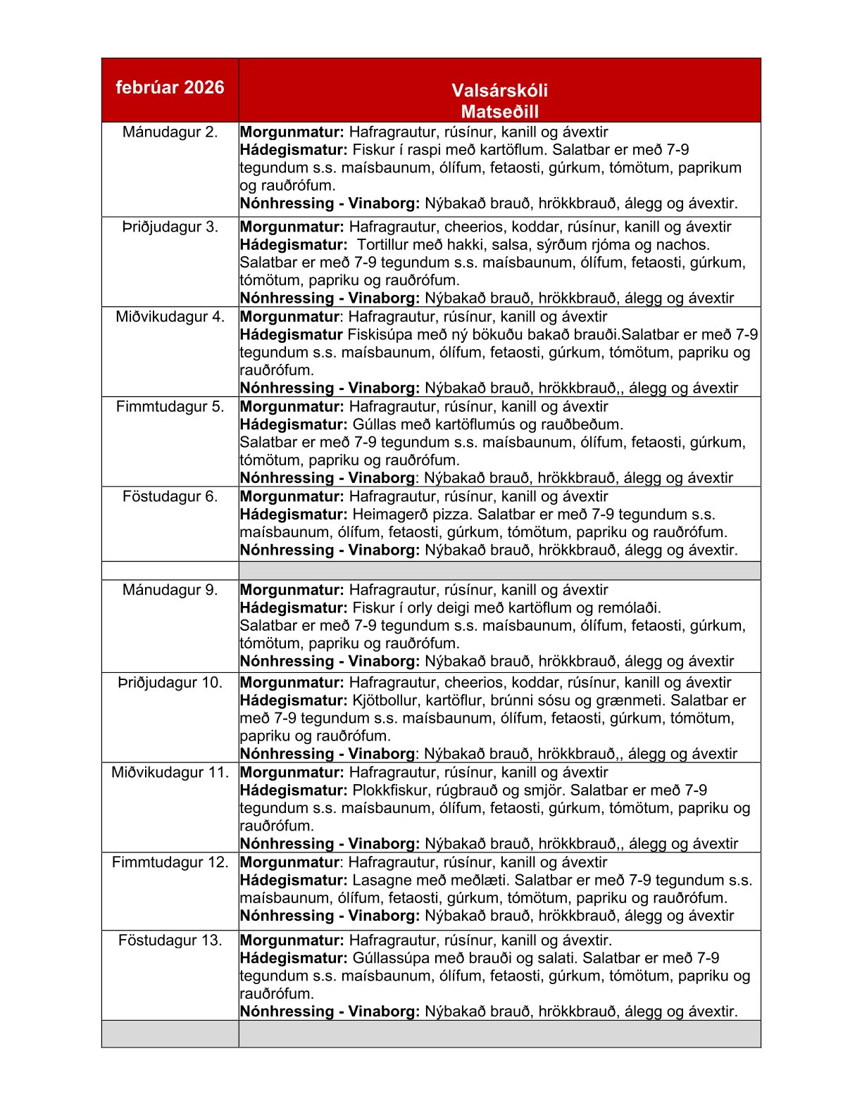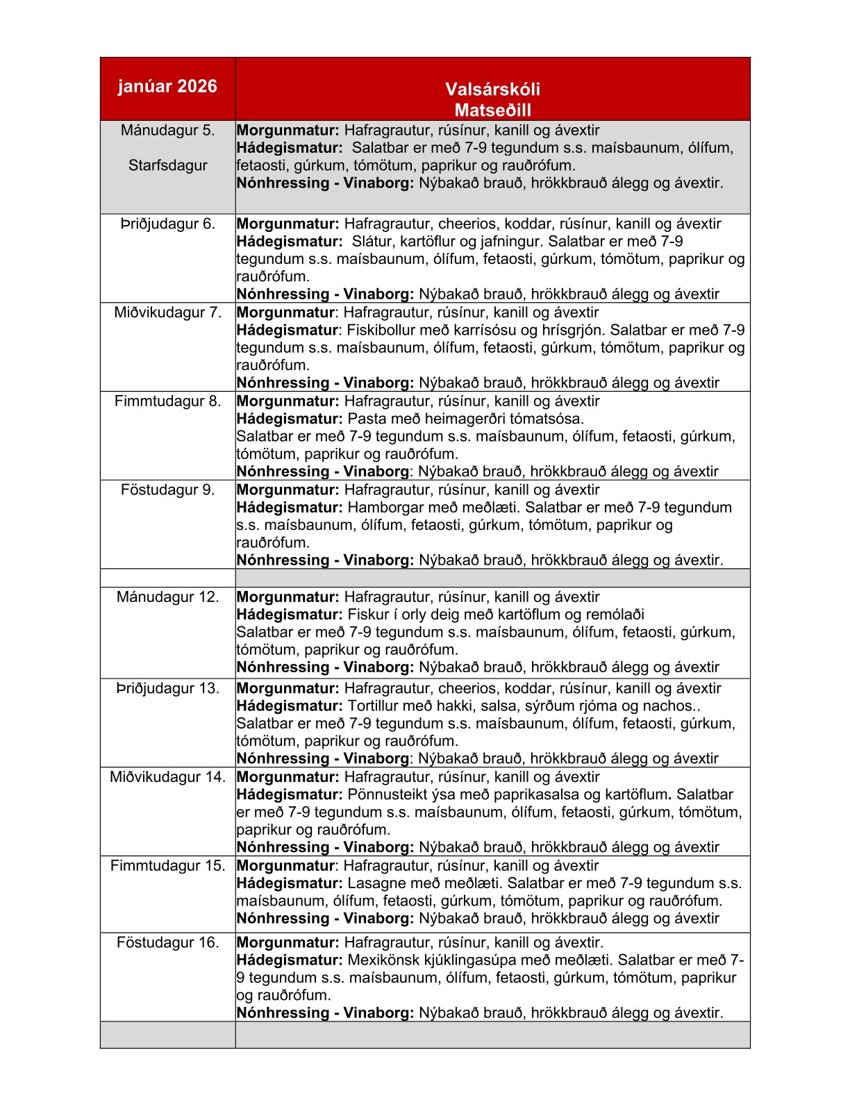 | Janúar 2026 | Matseðill Álfaborgar |