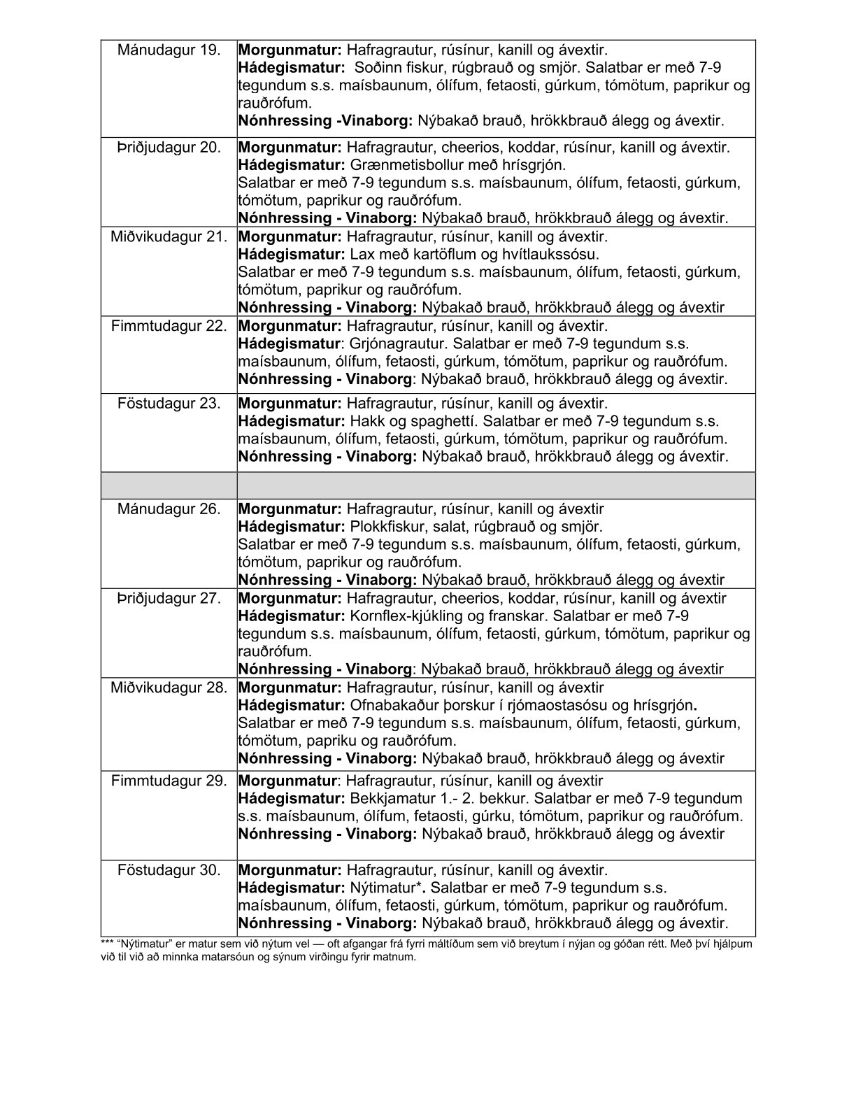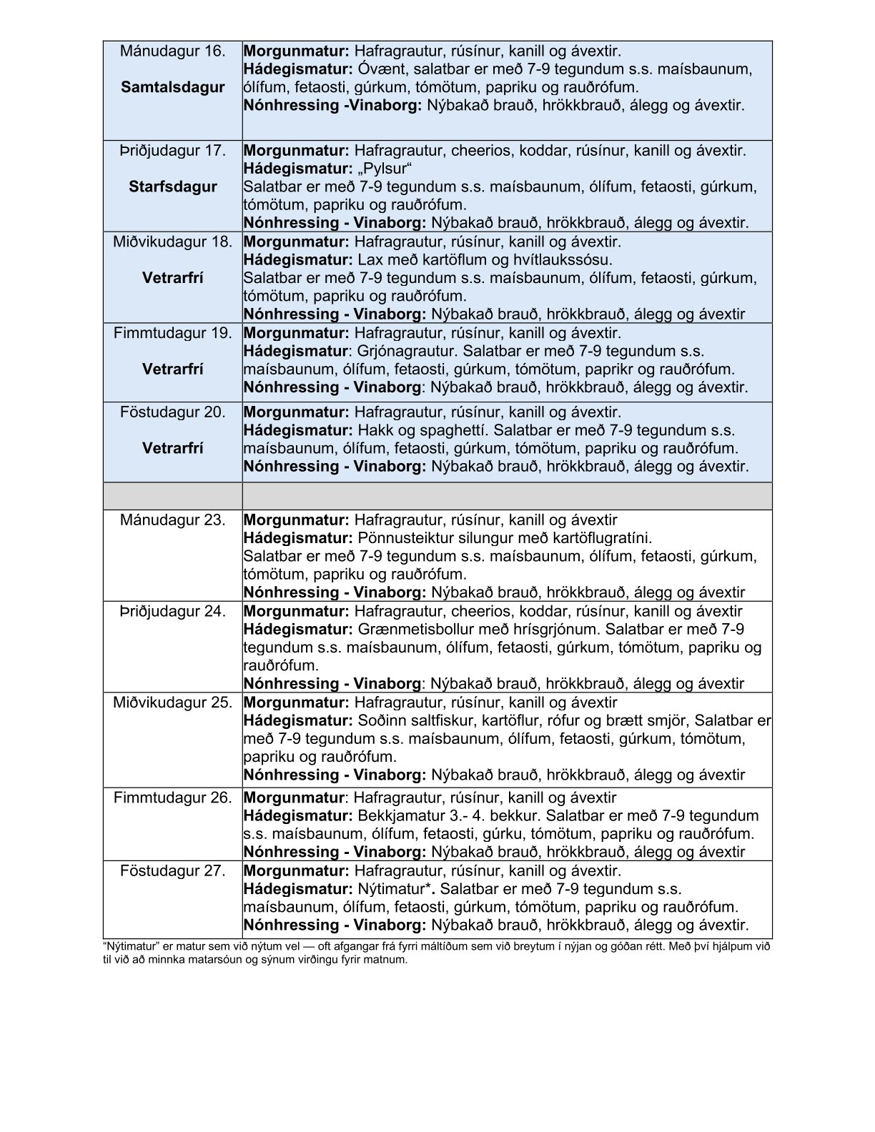 Morgunmatur: Ristað brauð með smjör, osti og skinku Hádegismatur: Nýtimatur Nónhressing: Nýbakað brauð og hrökkkex með smjör og áleggi